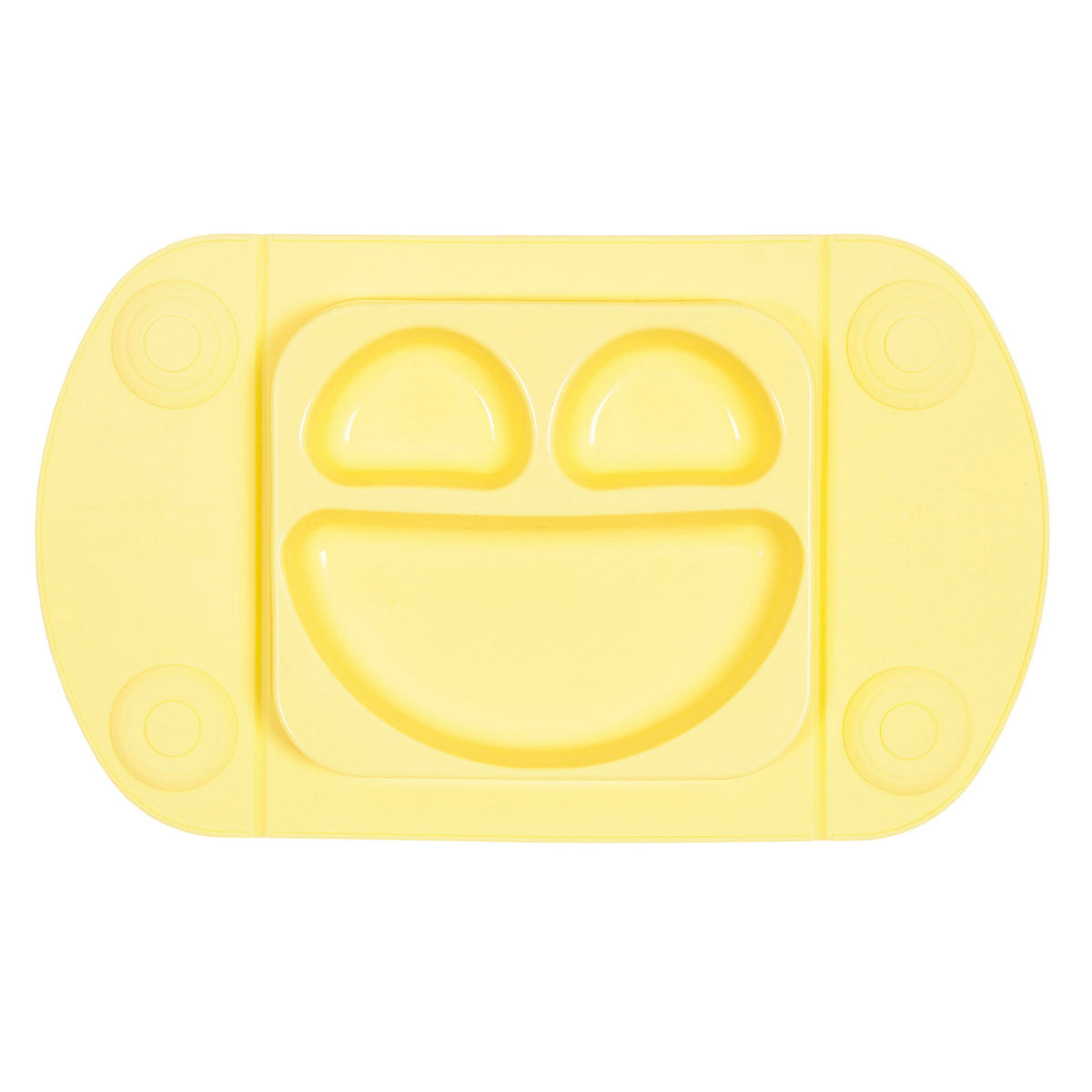 Universal fit small placemat with integrated happy face plate for high chair use. With 4 suction cups, folding sides, lid and carry case